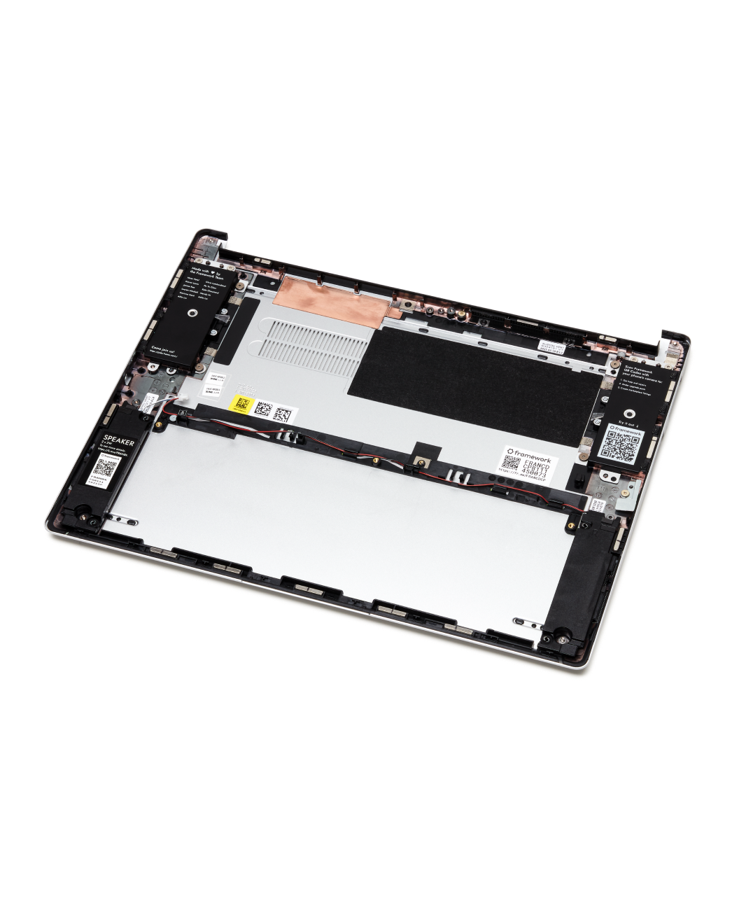 Durable and made of 50% post-consumer-recycled aluminum, the Bottom Cover Kit provides a sturdy base for the Framework Laptop. It includes the Audio Board, Audio Board Cable, Speakers, and WiFi Bracket.