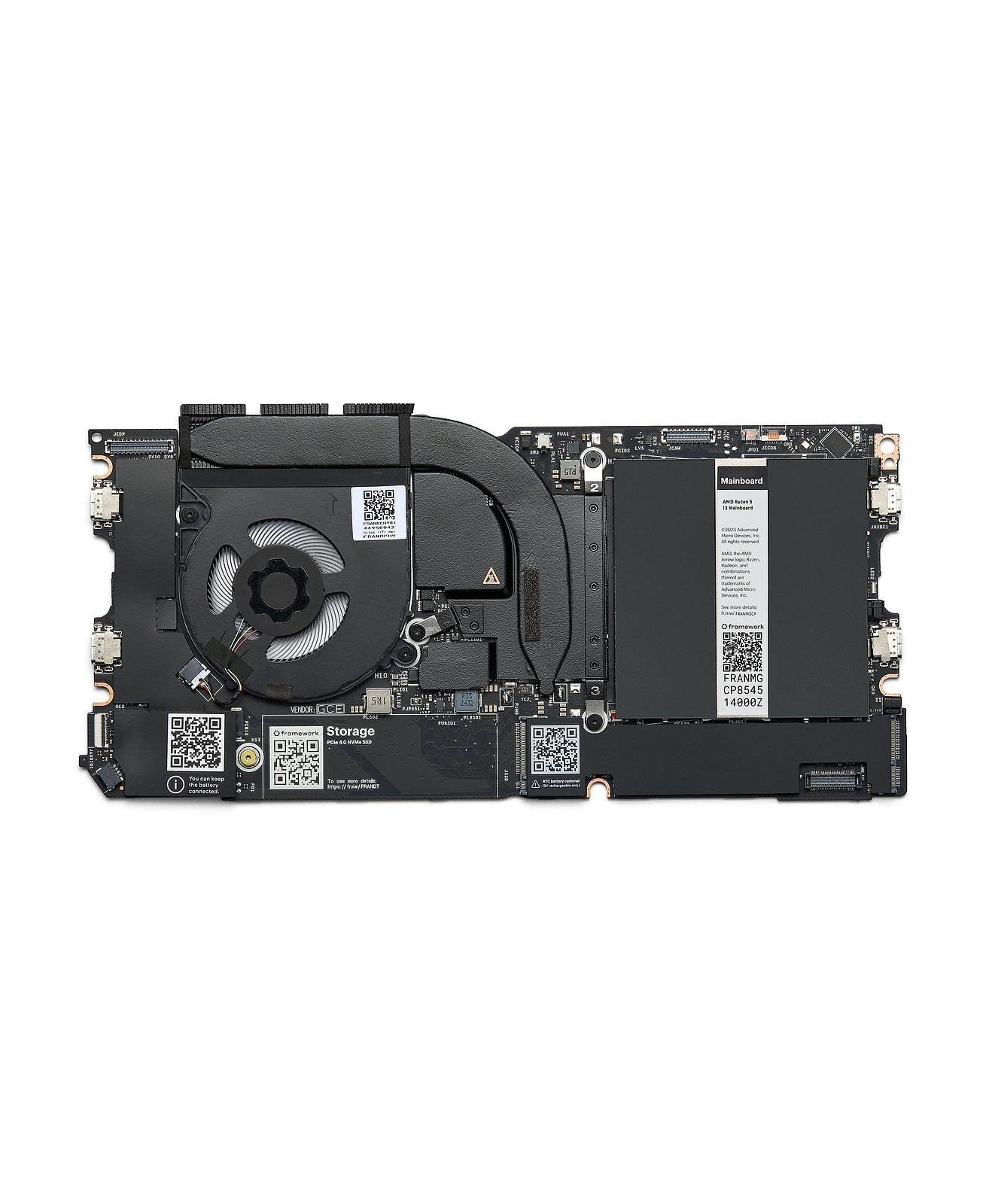 Available in three configurations of AMD Ryzen™ AI 300 Series processors with up to 12-cores/24-threads, the Framework Laptop 13’s Mainboard is designed for high performance and upgradeability. With up to AMD Radeon™ 890M integrated graphics, gaming performance reaches a new level of capability. This Mainboard utilizes our new Honeywell Phase Change Thermal Pad and comes with heatsink and fan pre-installed. Compatible with AMD RZ717 Wi-Fi 7 and DDR5-5600 memory.